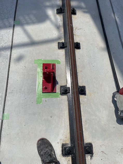 続いて行ったのは逸走防止アンカー止めです。これはクレーンが端まで走りすぎてしまわないようにするための、とても大事な安全対策。